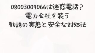 生活 08003009066は迷惑電話?電力会社を装う勧誘の実態と安全な対処法 「08003009066(0800-300-9066)」という見慣れない番号からの着信に、不安を感じた人は多いのではないでしょうか。最近、この番号からの電話が全国で報告されており、「電力会社のアンケートを装った自動音声」だという情報が相次い... 生活